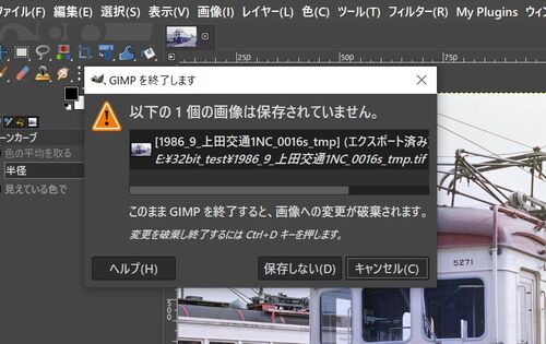 GIMP で Jpeg や TIFF ファイルなどを読み込んで編集し、エクスポートした後、GIMP を終了しようとすると必ず次のようなメッセージが表示されます。 「以下の1個の画像は保存されていません」 これは、編集結果を XCF 形式以外でエクスポートし保存し、かつ …