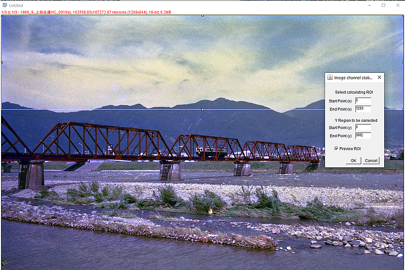 この画像は黄変が空の部分のみに広がっています。実はこの画像、Bチャンネル再建法ツールをデフォルト設定で走らせると、どうしても空の黄変に取り切れない部分が出てきてしまいます。もちろん、Bチャンネル再建法ツール適用後に、イエロー透過マスクを作成して追加補正を行えば黄変を取ることができます。とはいえ、Bチャンネル再建法ツールのデフォルト設定だと黄変が取り切れないということは、結構ダメージが大きいことを示しています。ところが、本ツールで画像統計を取ると...