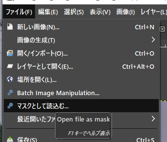 また、上記ダウンロードファイルに、GIMPに画像ファイルを任意のレイヤーにマスクとして貼り付ける、私が作成したGIMP用プラグインが同梱されています。GIMPを使って編集をされる方は、こちらのページをご覧になってインストールしてください。インストールがうまくいっていれば、下記のようにGIMPのメニューに現れます。