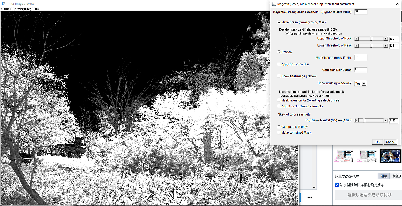 さらに、全体的に緑が強い中で、相対的にマゼンタであるところをカバーしたい、というような場合は、この閾値をかなり引き上げる (例えば30とか40) 必要があります。人間の目は色を相対値で認識し、絶対値ではありませんので、この値の設定はよく考える必要があります。なお、Ver. 0.25の改善点として、この値を動かすと、下記のように色マスク(グレースケールマスク)に関してプレビューするようになりましたので、この値の設定はだいぶ楽になりました。以下の白っぽい部分が、あとでこの画像をマスクとしてレイヤーに貼り付けて編集を行った場合、編集効果が及ぶ場所になります。