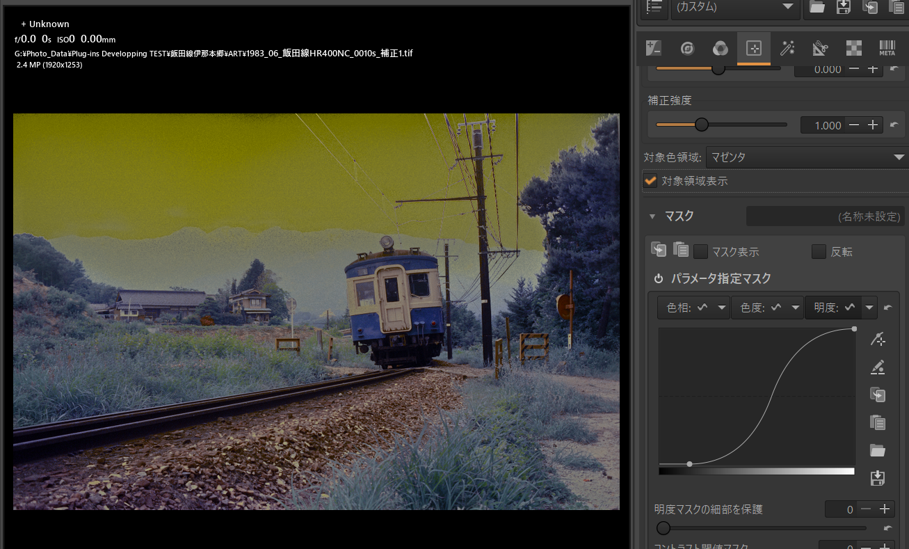 パラメータ指定マスクでシャドウ部を中心にマスクを有効にします。また電車の車体を避けるために、対象色の傾きを動かして、赤みの強いマゼンタを対象にします。この辺りは対象領域表示と照らし合わせながら決定していきます。