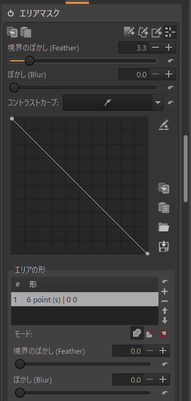エリアマスクは指定した範囲を除外しますが、除外するにはエリアを指定した後、コントラストカーブを使って逆対角に線を引くことで、指定したエリアを除外します。