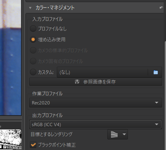 結局分かったのは出力プロファイルの問題でした。最初に出力した時、デフォルトの sRGB (ICC V2) を使っていました。ところがカラータブの下のカラーマネジメント設定から、出力プロファイルを以下のように sRGB (ICC V4) に変えてみると...